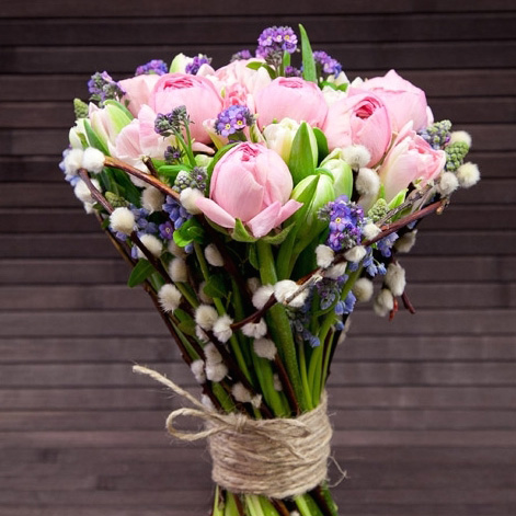 Неповоримый свадебный букет, выполненный из розового ранункулюса с добавлением белого тюльпана и украшений. Бутоньерка в подарок!