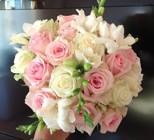 Букет Невесты из нежных розовых и белых роз с добавлением свадебных цветов фрезии станет настоящим украшением в день Вашего торжества.
