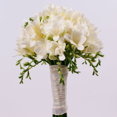 Свадебный букет выполнен из нежных цветков фрезии, украшенных лентой, ничего лишнего для прекрасного образа Невесты.