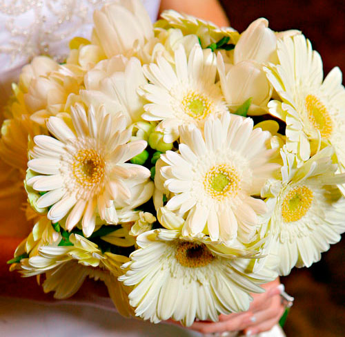 Свадебный букет, выполненный из гербер и тюльпанов станет изысканным украшением Невесты в день торжества.