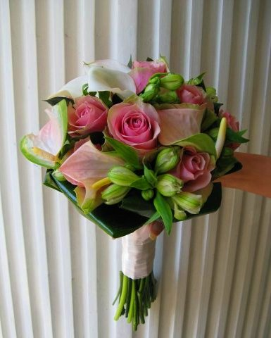 Очаровотаельный свадебный букет, собран из антуриумов с добавлением альстромерий и розовых роз.