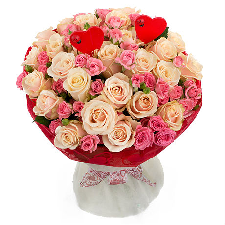 Нежное сочетание бежевой розы и кустовой розовой розы в этом букете станет приятным подарком для Вашей второй половинки!
