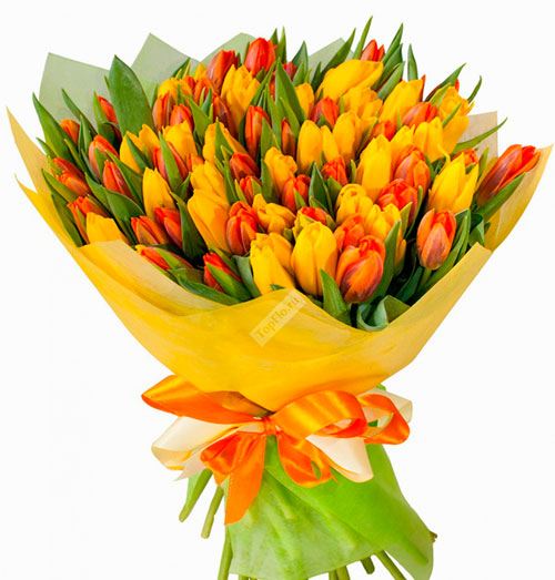 Яркая, солнечная композиция, выполненная из желтых и оранжевых тюльпанов, обязательно поднимет настроение и подарит море положительных эмоций!