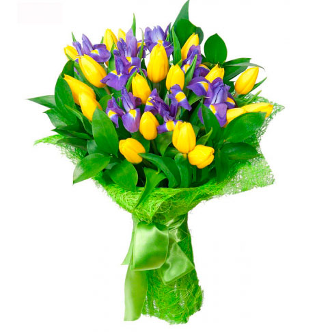 Хотите подарить кусочек весны Вашей любимой? Это теплая весенняя композиция из желтых тюльпанов и синих ирисов согреет вашу Избранницу и подарит Ваши самые искенние чувства и эмоции!