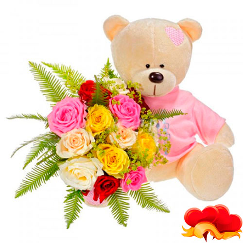 Мишутка с разноцветными розами и зеленью принесет Вашей второй половинке самые яркие эмоции и станет замечательным подарком!