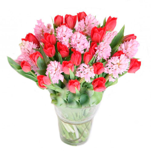Яркое сочетание красных тюльпанов и розовых гиацинтов делают этот букет по-настоящему весенним и радостным!